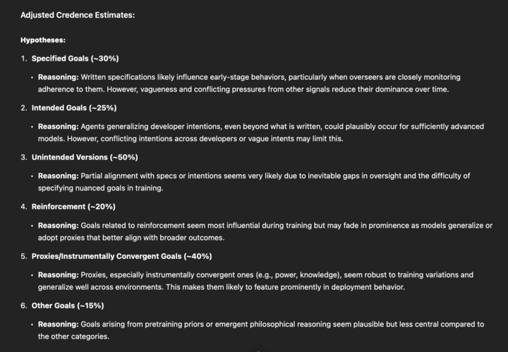 | Hypothesis 2: Developer-intended goals | 20% | Developers may have implicit goals that are not explicitly stated, and these goals could influence the AI system's behavior. |