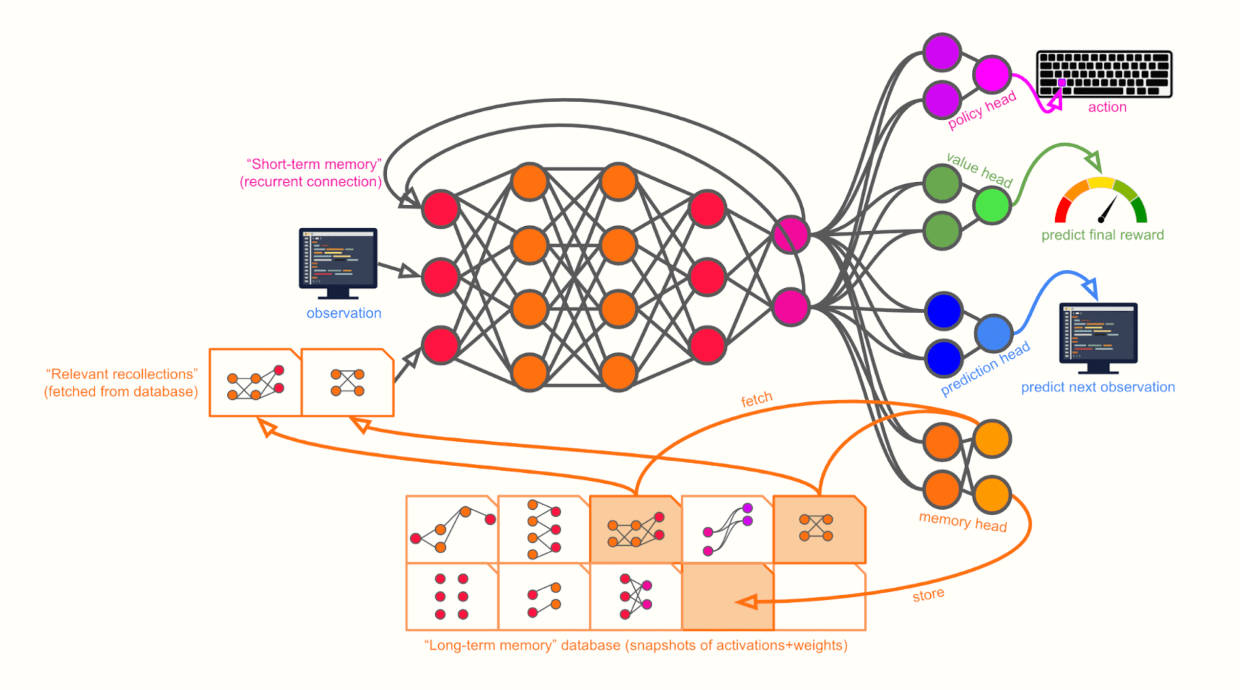 Unlike traditional transformers, Agent-3 is recurrent. In a nutshell, it doesn’t just output text, it also ‘outputs’ a large vector representing its internal state, which is then ‘read’ by its future self. This vector can convey much more information than the ‘chain of thoughts’ used by traditional LLMs, but alas, it is unintelligible to humans.