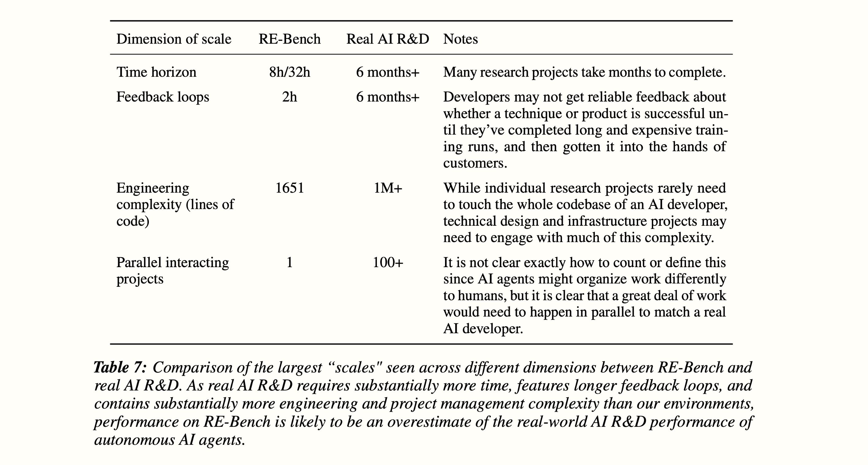 The RE-Bench paper notes four main categories of gaps between saturating RE-Bench and being able to conduct real AI R&D.
